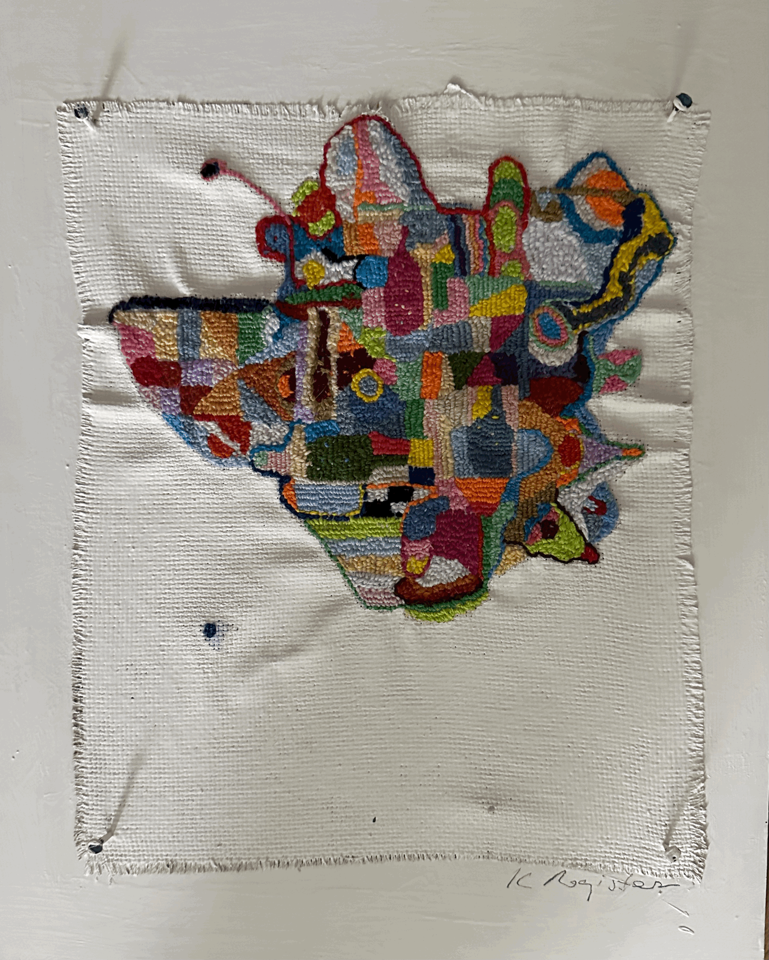 12x14.5” needlepoint, houseplant, black tacks on wood